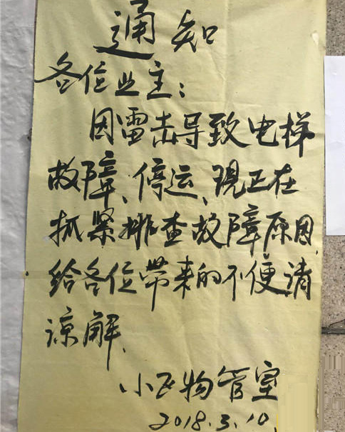 最近,家住咸陽一小區(qū)的很多住戶遇到了麻煩,他們的生活特別不方便,因為小區(qū)的電梯罷工已經(jīng)幾天了,這是咋回事呢? 原來事發(fā)的小區(qū)只有一棟樓,分為三個單元,每個單元只有一部電梯,而電梯突然癱瘓的原因,竟與一聲驚雷有關!