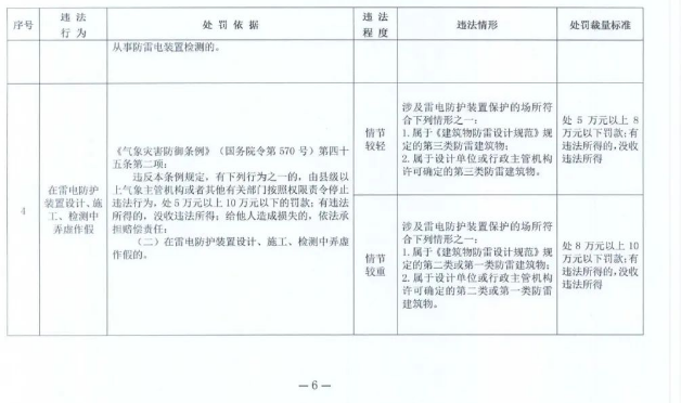 為了規(guī)范氣象行政處罰裁量權(quán)行使,促進依法、合理行政,維護公民、法人和其他組織的合法權(quán)益,依據(jù)《中華人民共和國行政處罰法》、《氣象行政處罰辦法》等法律法規(guī)規(guī)章和《國務院辦公廳關(guān)于進一步規(guī)范行政裁量權(quán)基準制定和管理工作的意見》,結(jié)合氣象工作實際,中國氣象局制定了《氣象行政處罰裁量權(quán)基準》,自2023年2月1日起施行。其中第二款對雷電防護管理類氣象行政處罰裁量權(quán)基準做出以下規(guī)定: